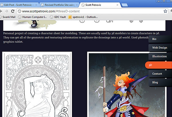 Besides typical CSS color and position changes, I did a few other things to make it seem less “out of the box”. I created two different navigation systems that were either for large displays or small displays. I added an Easing plugin to make the transitions with the internal links. I also made some custom form validation and AJAX requests for sending emails.