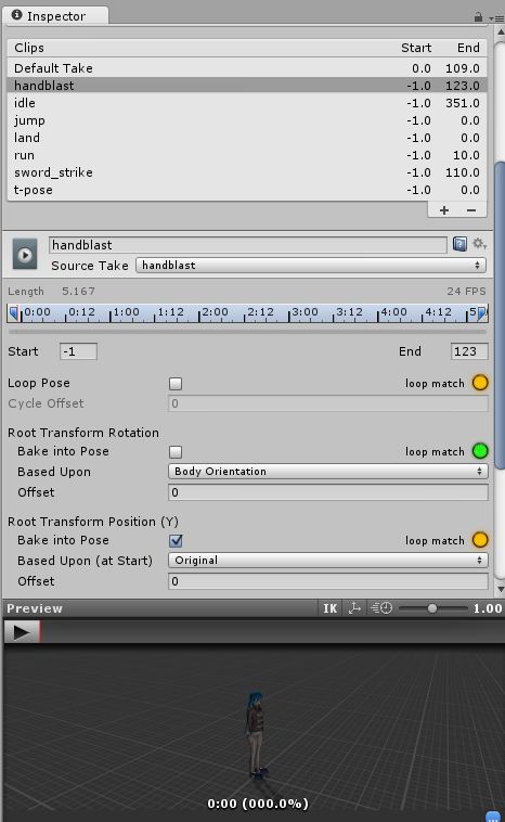 Selecting an animation from the clips will present options on how you want Unity to handle the animations. For my purpose, I am creating the motion inside of my 3d modeling tool. Unity will use the character translations and move the game object based off of it. This type of motion is considered “Root Motion”.